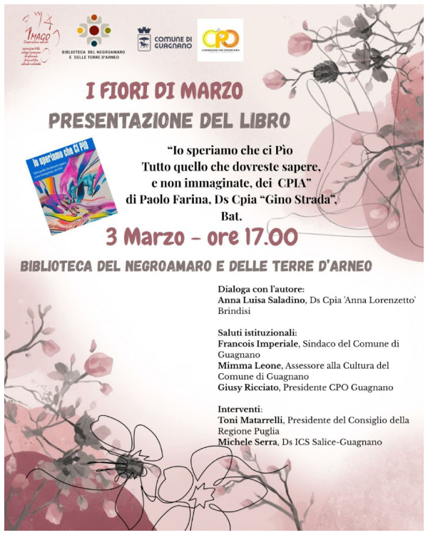 La Rassegna ‘Fiori di Marzo’, organizzata dal Comune di Guagnano, si aprirà ufficialmente martedì 3 marzo. Per l’occasione, si terrà, alle ore 17:00, presso la Biblioteca del Negroamaro e delle Terre d’Arneo, in via Pio XII, un’iniziativa culturale e formativa incentrata sul libro ‘Io speriamo che ci Pìo. Tutto quello che dovreste sapere, e non immaginare, dei CPIA’ ( EtEt Edizioni 2025) del Prof. Paolo Farina, Dirigente del CPIA BAT ‘Gino Strada’.