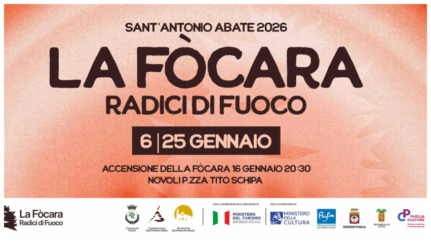 Intanto, nel piccolo comune salentino a nord di Lecce, la grande FESTA di SANT’ANTONIO ABATE 2026, prende il via già martedì 6 gennaio, con l’intronizzazione del santo, cioè il posizionamento del simulacro sull’altare maggiore della Chiesa di Sant’Antonio. Realizzata da Comune di Novoli, Comitato Festa Sant’Antonio Abate e Parrocchia Sant’Antonio Abate, con il patrocinio ed il sostegno del Ministero del Turismo, e con il patrocinio di Ministero della Cultura, Regione Puglia, Provincia di Lecce, Puglia Culture e Puglia Promozione, la festa de LA FÒCARA – Radici di fuoco prosegue fino al 25 gennaio, con ospiti come la storica band dei Negrita, la voce salentina nel mondo, Antonio Castrignanò e special guest Don Rico e Puccia: è una lunga rassegna di oltre 40 appuntamenti, tra devozione, ritualità, tradizione, cultura, arte, musica e spettacolo, per raccontare la storia di una comunità che da secoli custodisce, tramanda e fa rivivere in un rito collettivo la grande devozione al santo protettore del fuoco e degli animali.