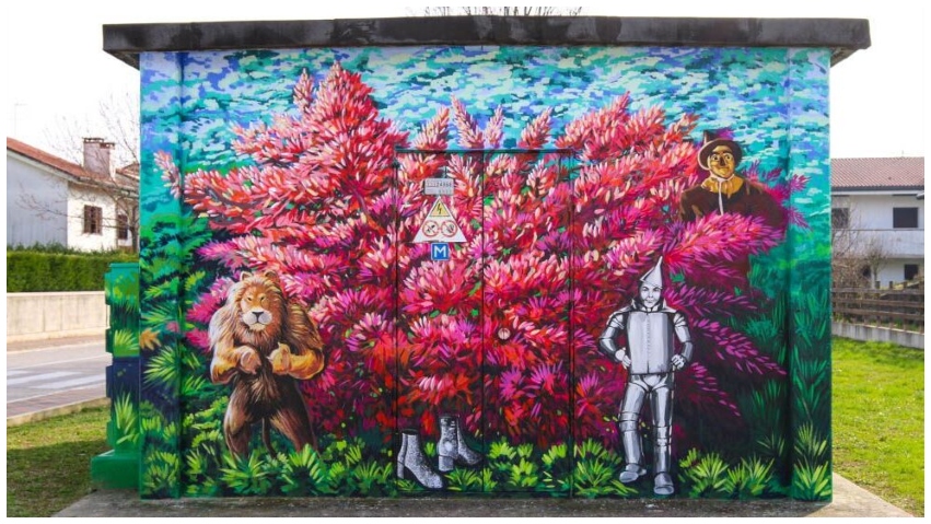 (FOTO DAL WEB: Murales della Cabina elettrica di E-Distribuzione realizzato in collaborazione con il Liceo Artistico Statale di Venezia “Guggenheim” a Fossò – VE)