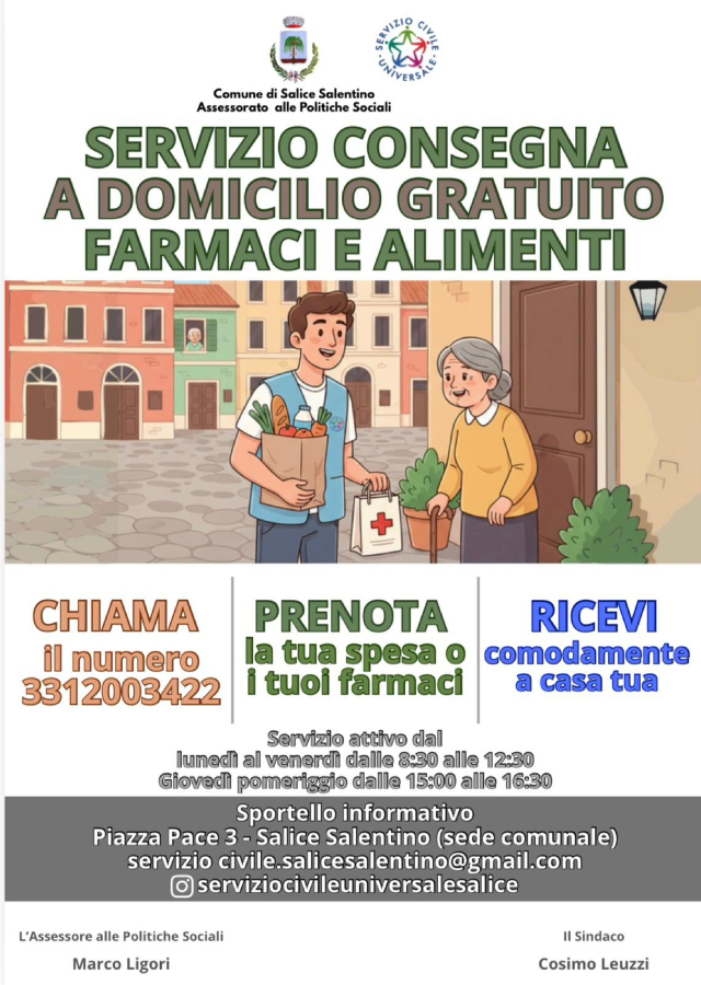 “Siamo orgogliosi di attivare questo servizio che rappresenta un concreto impegno dell’Amministrazione comunale verso i cittadini più fragili”, dichiara il Sindaco Cosimo Lezzi. “La consegna gratuita a domicilio di farmaci e alimenti non è solo un servizio, è un messaggio chiaro: nessuno verrà lasciato indietro. Questa iniziativa testimonia l’attenzione che mettiamo nel costruire una comunità inclusiva e solidale, dove le istituzioni sono presenti nella vita quotidiana delle persone”.