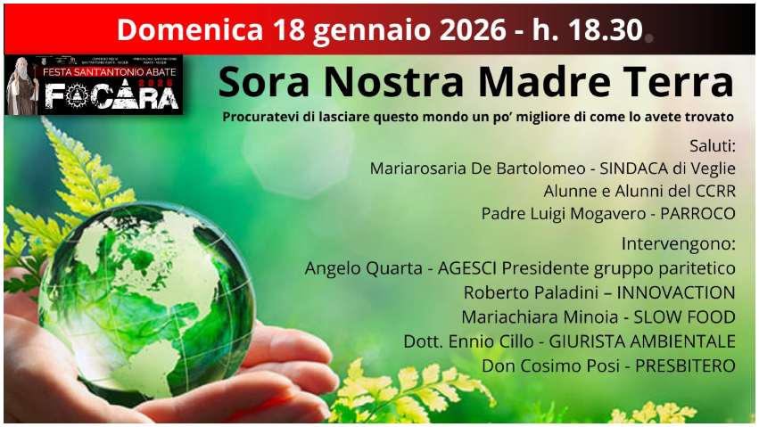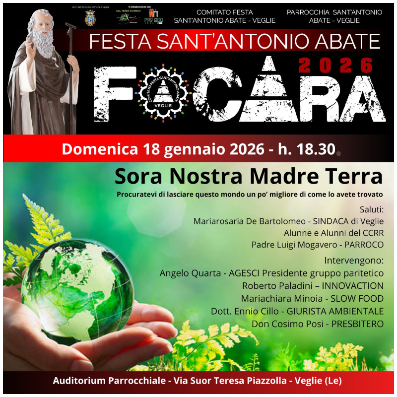 VEGLIE – Ad aprire ufficialmente la settimana di preparazione alla festa in onore di Sant’Antonio Abate a Veglie sarà l’incontro dal titolo “Sora Nostra Madre Terra – Procuratevi di lasciare questo mondo un po’ migliore di come lo avete trovato”, dedicato al rispetto del creato e all’ecologia, ispirato ai temi dell’enciclica Laudato Si’ di Papa Francesco.
