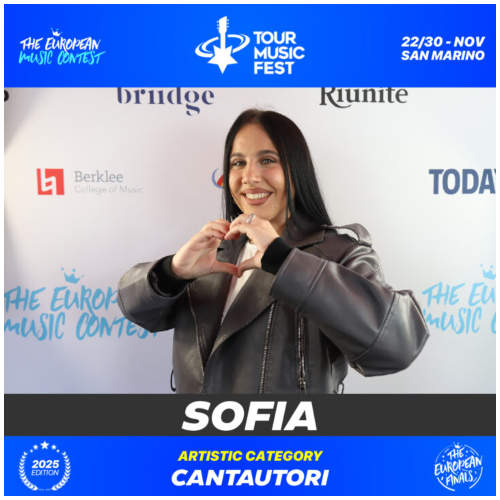 Il nuovo obiettivo di Sofia, è quello di guadagnarsi un posto nella finalissima europea del Tour Music Fest in programma il 30 Novembre presso l’Auditorium Little Tony di San Marino al cospetto di Beppe Vessicchio, Francesco Rapaccioli, Paola Folli e dell’attesissima Kara Dio Guardi, giurata di American Idol e autrice per Pink, Demi Lovato, Anastacia e tanti altri artisti di fama internazionale.