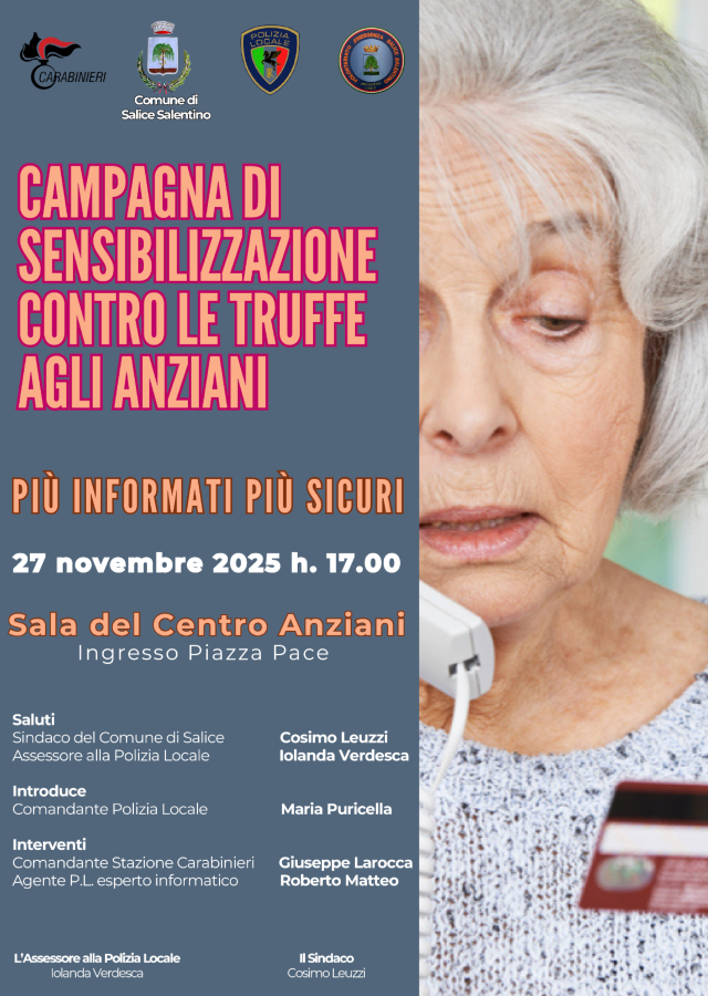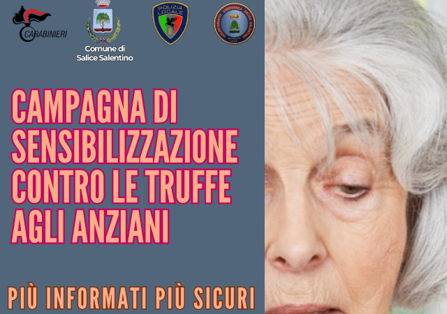 Ideato dall’Amministrazione Comunale e attuato dalla Stazione Carabinieri di Salice Salentino e dal Comando di Polizia Locale, il progetto coinvolge personale specializzato, impegnato ad affrontare in modo coordinato e professionale il tema della sicurezza, con interventi mirati alla prevenzione e al contrasto dei reati di truffa.