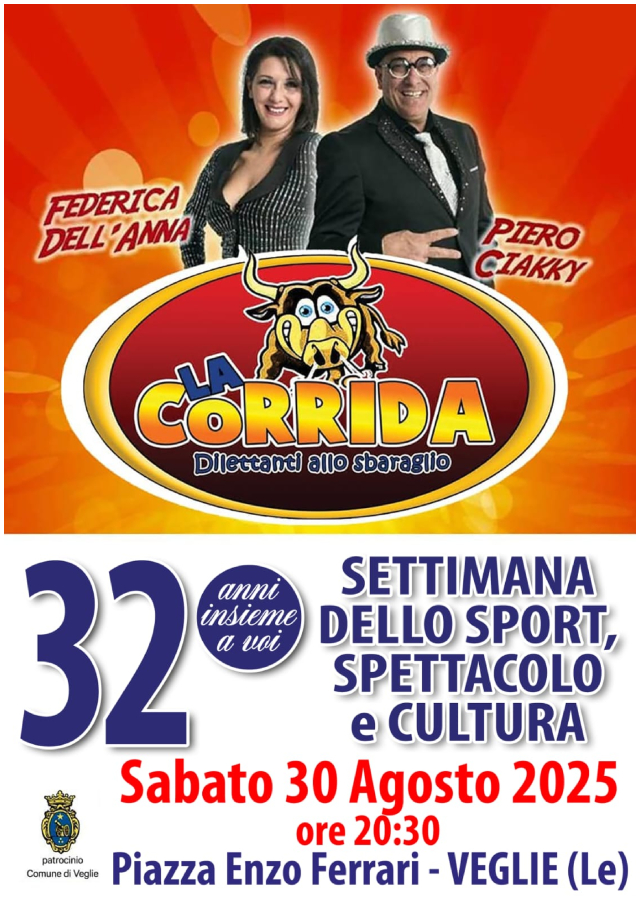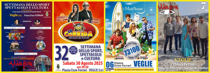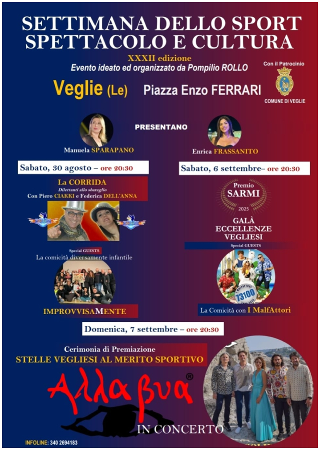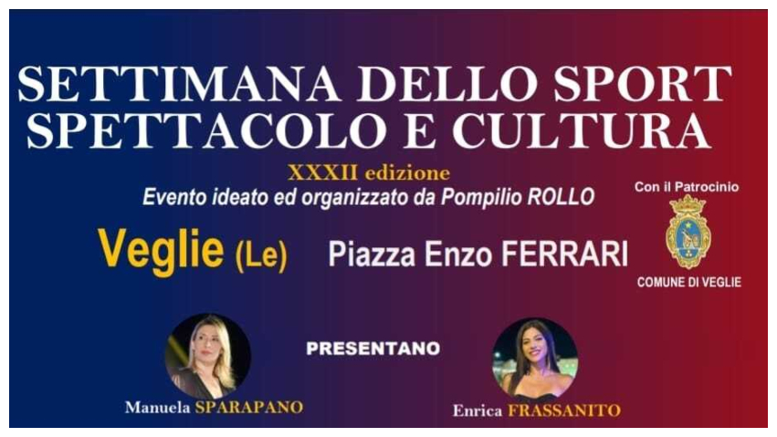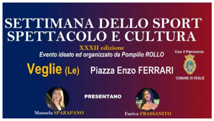 VEGLIE – È tutto pronto a Veglie per la 32ª edizione della “Settimana dello Sport Spettacolo e Cultura” ideate ed organizzata da Pompilio Rollo che si svolgerà in Piazza Ferrari a Veglie.
