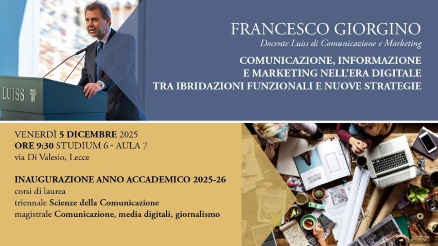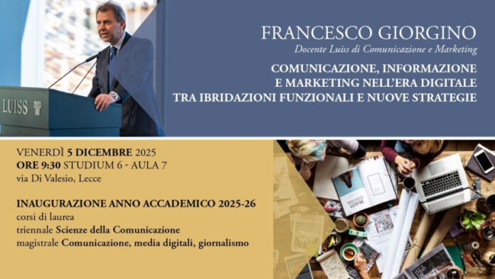 LECCE – Si svolgerà il prossimo venerdì 5 dicembre – ore 9:30, edificio Studium 6 di via Di Valesio a Lecce – l’inaugurazione dell’a.a. 2025-26 dei corsi di studio triennale di Scienze della Comunicazione e magistrale di Comunicazione, media digitali, giornalismo dell’Università del Salento.