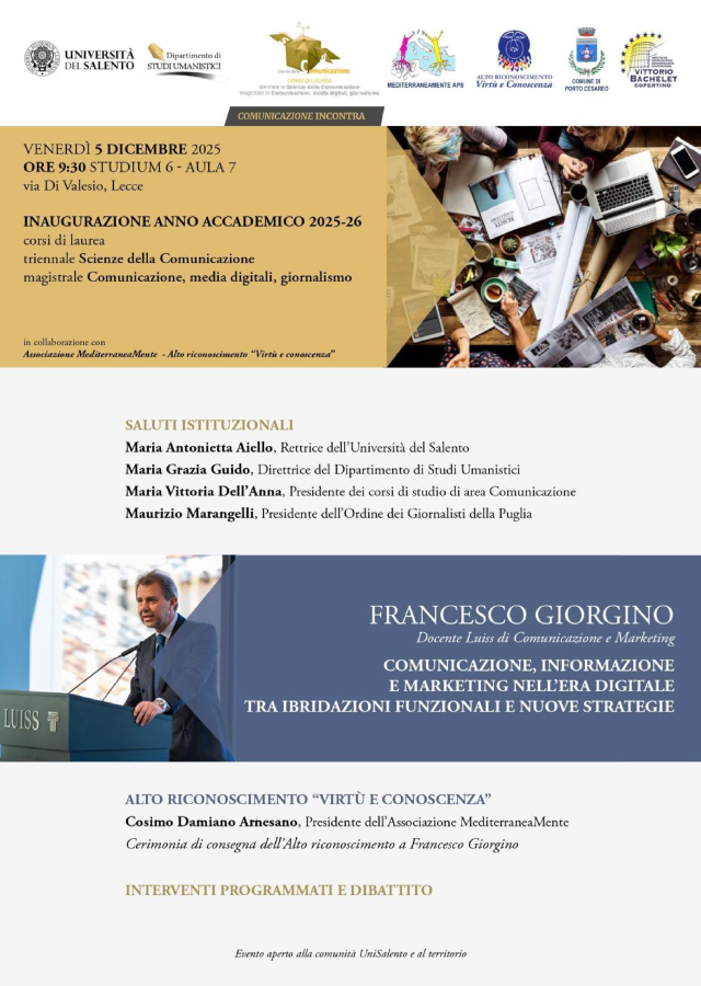 Dopo i saluti istituzionali (Maria Antonietta Aiello, Rettrice Università del Salento; Maria Grazia Guido, Direttrice del Dipartimento di Studi Umanistici; Maria Vittoria Dell’Anna, Presidente dei corsi di studio di area Comunicazione; Maurizio Marangelli, Presidente dell’Ordine dei Giornalisti della Puglia), la mattinata proseguirà con la lectio magistralis di Giorgino sul tema Comunicazione, informazione e marketing nell’era digitale tra ibridazioni funzionali e nuove strategie e con la consegna dell’Alto Riconoscimento alla presenza dell’ideatore del premio, Cosimo Damiano Arnesano, e di Filomena D’Antini, Consigliera nazionale di Parità e presidente della giuria tecnico-scientifica del “Virtù e Conoscenza”.