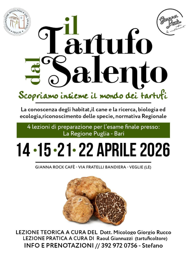 L’Associazione Micologica del Salento organizza a Veglie il 14, 15, 21, 22 aprile 2026 un Corso di Formazione per l’Esame “Tesserino Raccolta Tartufi” presso la Regione Puglia